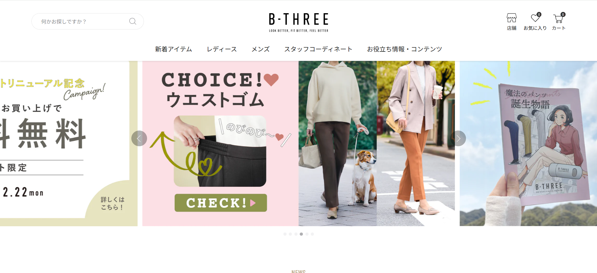 B-THREE(ビースリー)は、「美しさ」と「快適さ」を妥協なく追求したストレッチパンツ専門ブランドです。360°伸びてしっかり戻るオリジナル素材、こだわりの美脚設計、そして環境に配慮した企業姿勢により、お客様の日常に笑顔と快適さをお届けしています。